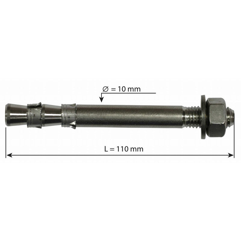 This is the longest bolt in the 10mm range (diam.M10x110 mm stainless steel AISI 316L); this allows for excellent holding value on all types of suitable rock (moderately hard to compact rock).